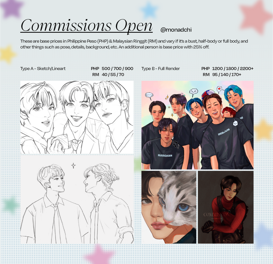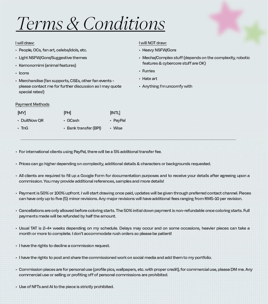 please read my terms & conditions thoroughly. DM me on any of my socials or email to book a commission!